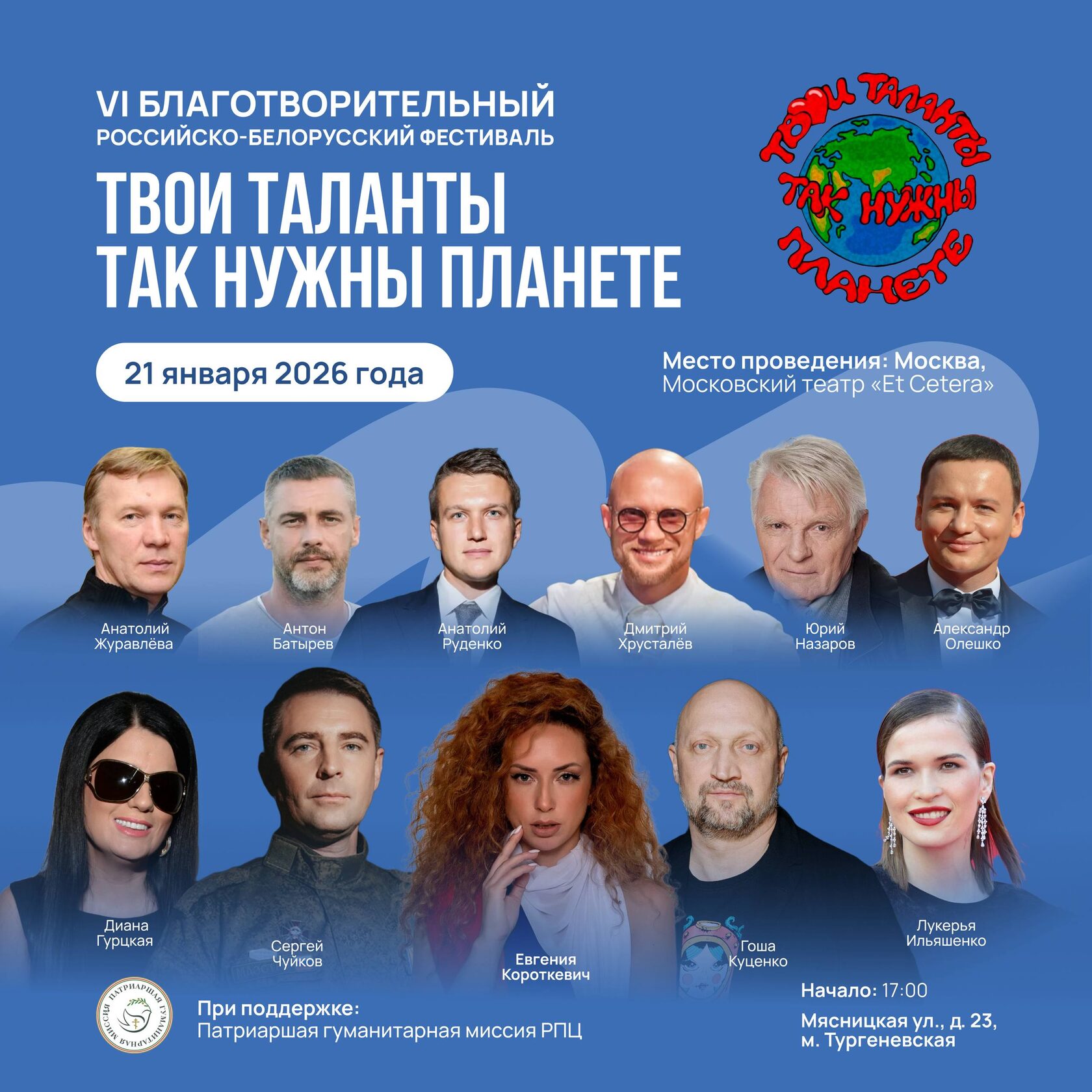 21 января 2026 года в 17:00 пройдёт шестой благотворительный международный фестиваль «Твои таланты так нужны планете» при поддержке патриаршей гуманитарной миссии РПЦ. В центре Москвы Театр “Et Cetera” под руководством А.А.Калягина.